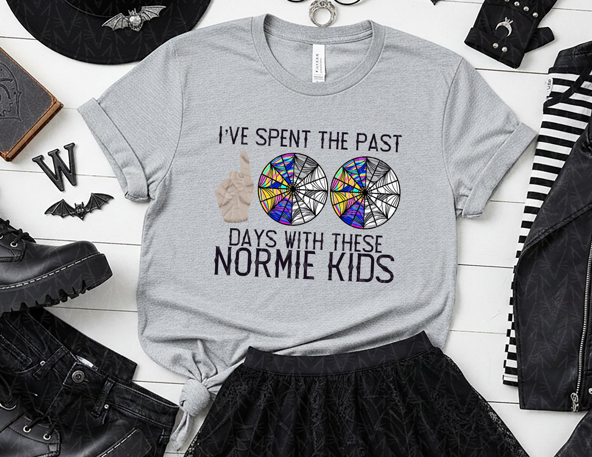 Celebrate the 100th day of school with a tee that brings a delightfully dark and whimsical twist to your classroom style. Featuring a bold stained-glass–inspired design and a quirky little hand character, this shirt jokes that after 100 days, even the “normies” are starting to fit right in. It’s the perfect blend of spooky charm and school-year humor, making it a standout choice for teachers, staff, and students who love a touch of gothic fun. Wear it to mark your milestone with personality, mystery, and just the right amount of mischievous flair.