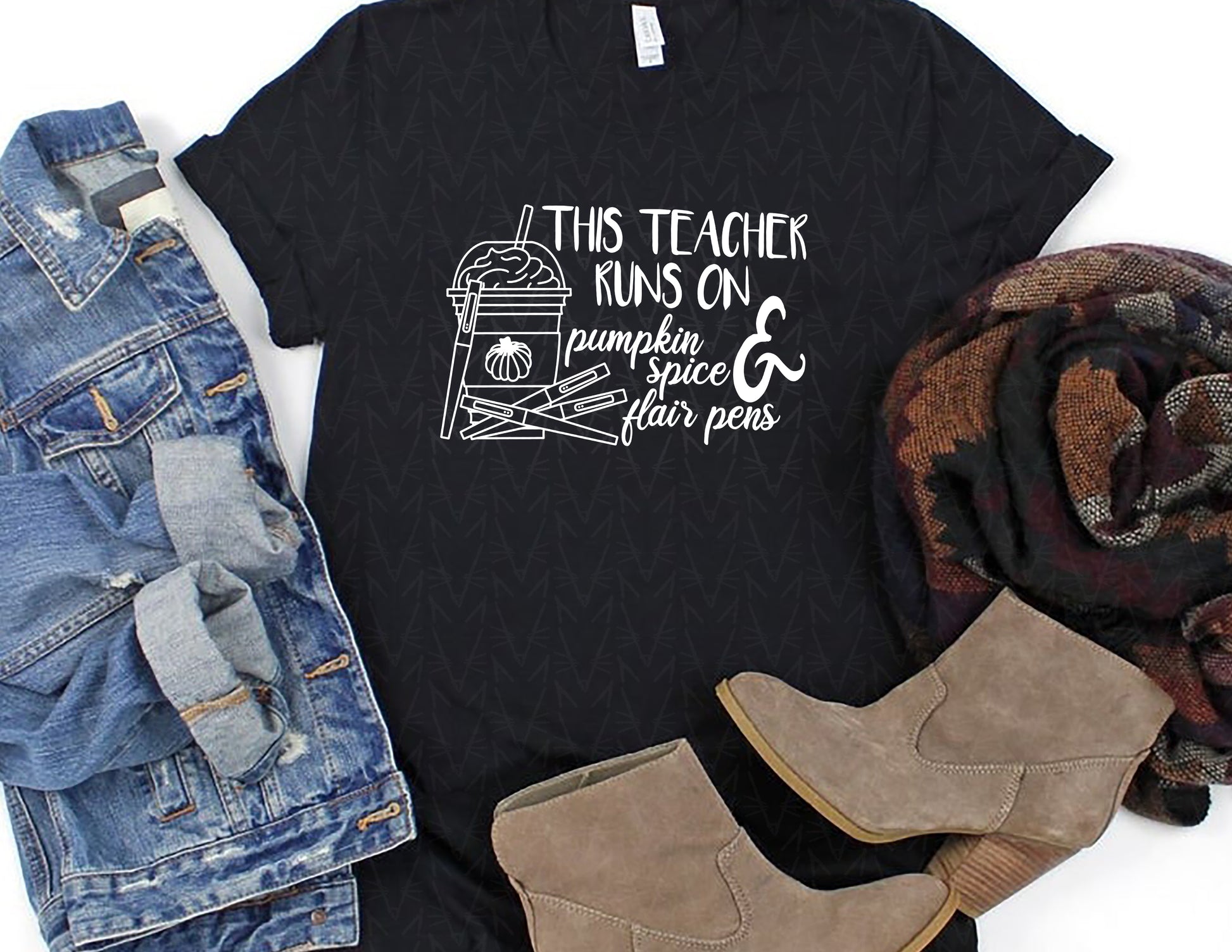 This Teacher Runs on Pumpkin Spice & Pens Shirt (White Graphic)